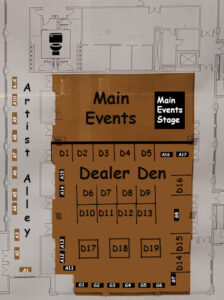 Artist Tables in the Dealer Den include a 6′ table, two chairs, and two exhibitor badges. $130